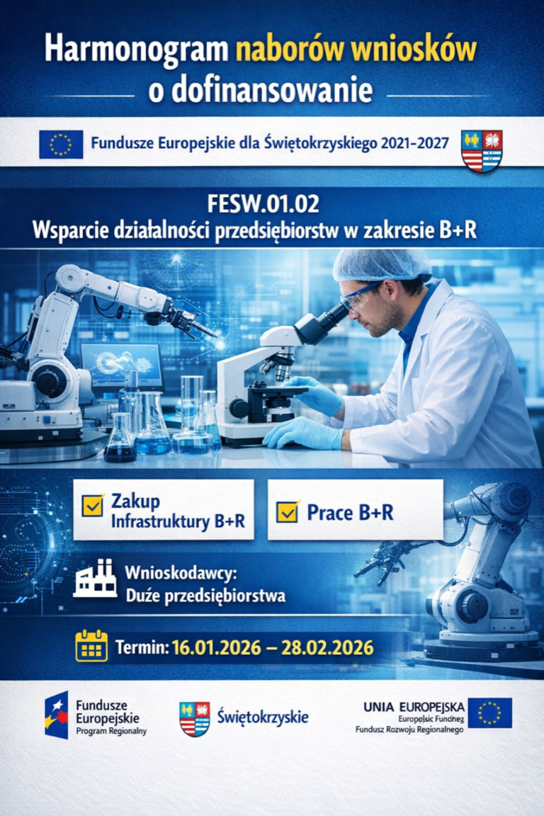 OGŁASZA NABÓR DLA PRZEDSIĘBIORSTW Data rozpoczęcia -zakończenia: 16.01.2026 – 28.02.2026 FESW.01.02 Wsparcie działalności przedsiębiorstw w zakresie B+R Wsparcie działalności przedsiębiorstw w zakresie B+R Tytuł naboru: 1. Zakup Infrastruktury B+R